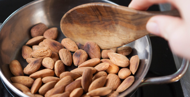 Die Mandeln röstest Du ohne Öl in einer Pfanne, bis sie anfangen zu duften – das riecht ein bisschen nach Weihnachten. Anschließend pürierst Du die Mandeln, entweder mit einem Pürierstab oder in einem Stand-Mixer, bis eine cremige Masse entsteht. Erst sind es Stückchen, dann Mehl, und erst zum Schluss wird Mus daraus. Das kann bis zu 15 Minuten dauern und ist für schwache Küchengeräte eine echte Herausforderung. Wenn Du merkst, dass Dein Mixer warm wird, gönn‘ dem Motor zwischendurch lieber eine Verschnaufpause zum Abkühlen. Am Ende kannst Du den Geschmack und die Konsistenz variieren, indem Du etwas neutrales Öl zugibst und eventuell Honig, Sirup, Salz oder Gewürze unterrührst – aber kein Wasser, denn dann wird das Mus schnell schlecht. Nun musst Du das Mus nur noch in kleine Einmachgläschen geben und gut verschließen, so hält es sich bis zu einem Jahr. Und fertig ist Dein Mandelmus! Tipp: Wenn Du ganz helles Mandelmus haben willst, gibst Du die Mandeln vor dem Rösten in heißes Wasser. Nach kurzer Zeit löst sich die Haut von den Mandeln. Jetzt nimmst Du sie aus dem Wasser, schreckst sie unter kaltem Wasser ab und dann kannst die Haut mit den Fingern leicht ablösen. Durch das Anrösten verschwindet dann auch der letzte Rest Wasser von den Mandeln.